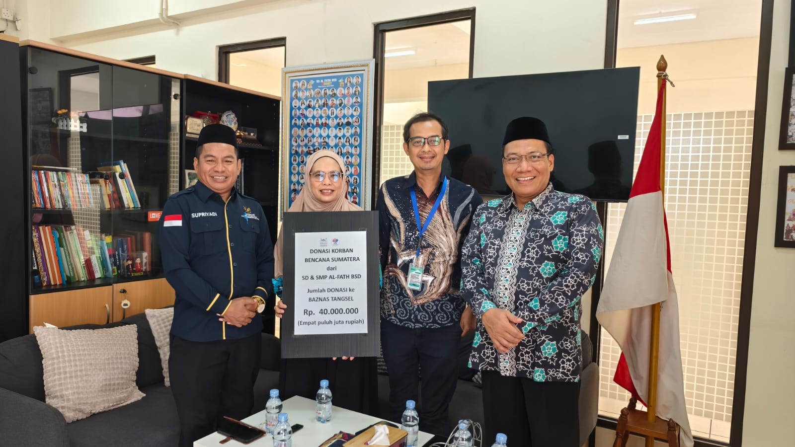 Penyerahan donasi dilakukan oleh Sri Indarwati Candra (Kepala Sekolah SD Al-Fath BSD), Taufiq (Kepala Sekolah SMP Al-Fath BSD), serta Ari Mahfudin (Wakasek Kesiswaan SMP Al-Fath BSD). Mereka membawa amanah besar dari lingkungan sekolah, amanah yang dikumpulkan dari kotak-kotak donasi, acara internal, kegiatan spontan siswa, hingga dukungan penuh para orang tua yang ingin turut serta meringankan duka saudara-saudara kita.